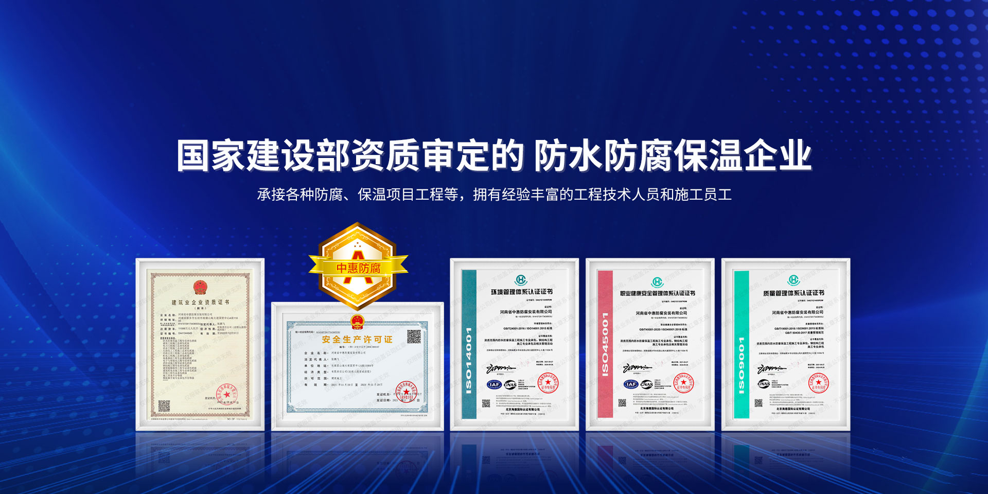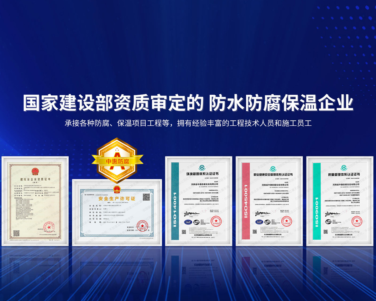 公司經營范圍:防水防腐保溫工程;消防設施工程;建筑裝修裝飾工程;建筑機電安裝工程;電力工程;建筑工程;石油化工工程;工業清洗工程;油罐清洗工程;鋼結構工程;環保工程;模板腳手架工程;電纜防火封堵、防污閃噴涂、外墻外保溫工程;各類施工勞務作業;設備維修、船舶鉚焊、涂裝;電力工程材料、建材、防水材料、防火材料、防腐保溫材料銷售,并相繼通過了GB/T19001-2008idtISO9001:2008GB/T50430-2007質量管理體系認證證書。GB/T24001-2004idtISO14001:2004環境管理體系認證證書。GB/T28001-2011idtOHSAS18001:2007職業健康安全管理體系認證證書。公司是中國防腐蝕于防護協會、中國施工企業管理協會、電力協會和中國鋼結構防水協會會員單位。 公司的經營業務涵蓋了石油、化工、電力、冶金、煤炭、船舶、國防、燃氣、水利、環保、交通運輸、航空及國防軍工和輕紡市政等行業的防腐保溫絕熱設備。鋼結構安裝、防火、防水、金屬噴鍍、聚脲噴繪、陰極保護、防滲透堵漏、玻璃鋼及各種磚版材料襯里、橡膠襯里、煙氣硫和耐酸溶劑腐蝕等工程施工。公司連續十年榮獲“省市先進施工企業”“安全生產先進單位”“重合同,守信用企業”和“AA***資質企業”的稱號。2000年被命名為市級文明單位,2002年被國家工商行政管理局命名為“重合同,守信用的企業”、被中國工業防腐蝕技術協會命名為“防腐蝕企業,能源節約及環境保護領域有豐富的經驗和***的業績。工程一次交驗合格率100%。其中攀枝花鋼鐵公司煉鐵廠四號高爐及熱風爐防腐工程、上海寶鋼公司煤氣柜防腐工程、撫順石油一廠裝置防腐項目、齊魯石化公司稀烴廠高塔防腐工程、吉林化學工業公司煉油廠油罐防腐工程、天津石化熱電廠六號爐頂棚聯絡管保溫工程、大慶油田(太倉)力神泵業工程、中國化學工程第十一建設工程、中原油田勘探局工程、中國石化銷售有限公司華北分部、魯皖輸油管道工程、貴州開磷息烽合成氨工程、陜西黃陵煤化工程、中國石油天然氣西部管道塔里木輸油工程、邯鋼集團邯寶鋼鐵公司煉鐵工程、德州供電工程、吉寶(南通)船廠工程,偃師華潤熱力工程、鄭州熱力總公司。 河南省中惠防腐安裝有限公司愿以豐富的施工經驗,***的技術,***的設備,***的管理,***的服務,竭誠為國內外廣大的用戶提供***滿意、******的工程作品。 我公司愿與國內外同仁一道,團結協作,共同推進防腐蝕行業發展! 公司地址:河南省長垣縣建設路北段360號 固定電話:0373-8866488 郵編:453400 網址:http://www.jingshiye.com